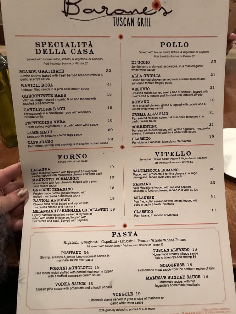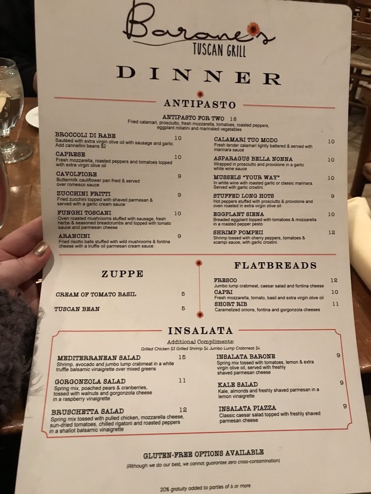 Barone’s Tuscan Grill, located in Moorestown, NJ, offers a wide range of Italian dishes and amenities such as outdoor seating, waiter service, and private dining. Highlights from the menu include Baked Clams, Broccoli Rabe and Sausage, and the flavorful Caprese appetizer. The restaurant also serves delicious Flatbreads like the Prosciutto Flatbread with a drizzle of honey. The Chicken Orzo Soup and Cream of Tomato Basil Soup are perfect starters for a meal. Barone’s Tuscan Grill strives to provide a welcoming and inclusive environment, with options for vegans and limited vegetarian choices. The restaurant is women-owned and offers Happy Hour specials, making it a great spot for a casual dining experience. Don't miss out on the delicious Italian cuisine at Barone’s Tuscan Grill!
